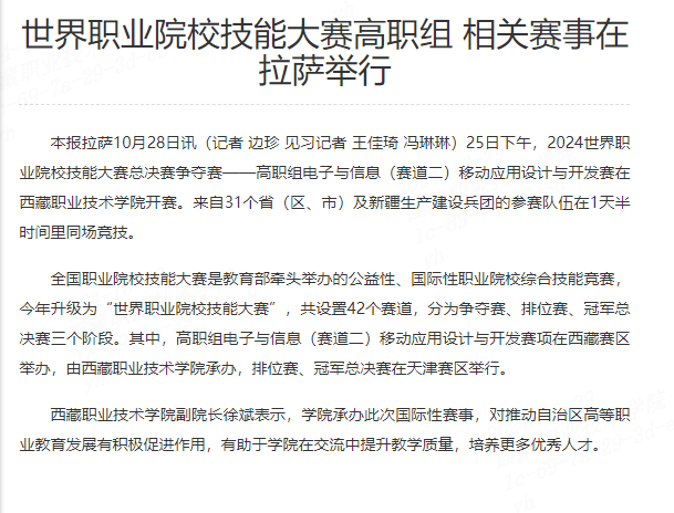 本报拉萨10月28日讯(记者 边珍 见习记者 王佳琦 冯琳琳)25日下午,2024世界职业院校技能大赛总决赛争夺赛——高职组电子与信息(赛道二)移动应用设计与开发赛在beway必威精装版开赛。来自31个省(区、市)及...