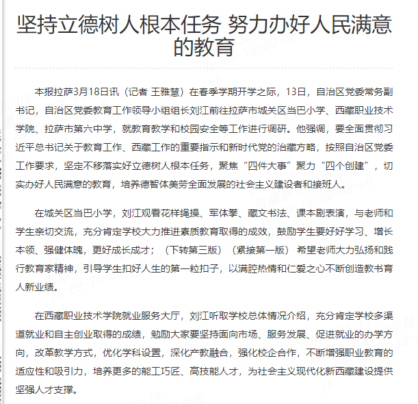 本报拉萨3月18日讯(记者 王雅慧)在春季学期开学之际,13日,自治区党委常务副书记,自治区党委教育工作领导小组组长刘江前往拉萨市城关区当巴小学、beway必威精装版、拉萨市第六中学,就教育教学和校园安全等...
