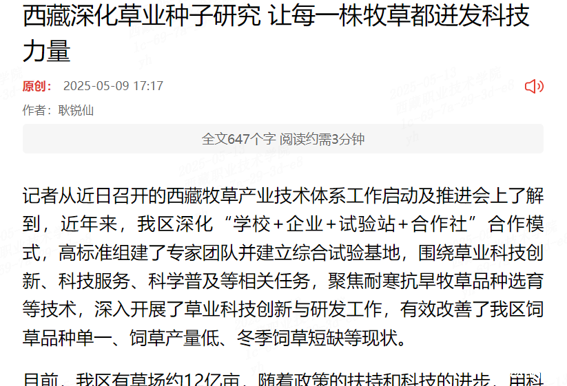 记者从近日召开的西藏牧草产业技术体系工作启动及推进会上了解到,近年来,我区深化“学校+企业+试验站+合作社”合作模式,高标准组建了专家团队并建立综合试验基地,围绕草业科技创新、科技服务、科学普及等相关...