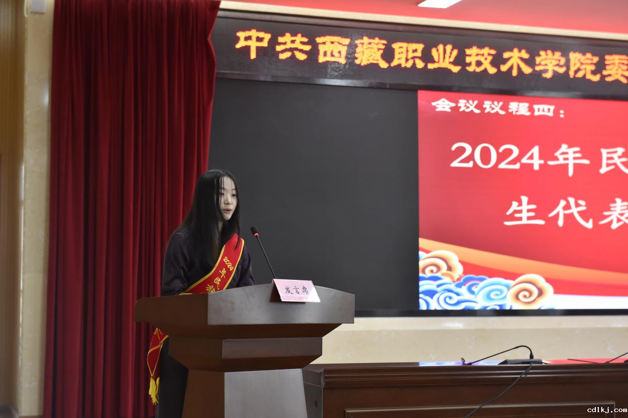图为民族团结进步模范学生代表杨宽宽同学发言